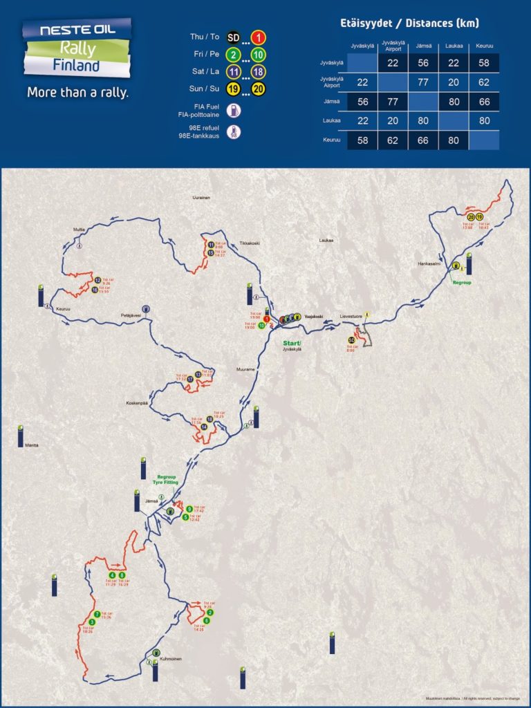 Bazą rajdu ponownie będzie Jyväskylä. W czwartek odbędzie się jeden OS, a najbardziej wymagającym dniem będzie piątek, kiedy kierowcy przejadą 9 OS-ów bez serwisu.