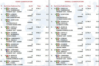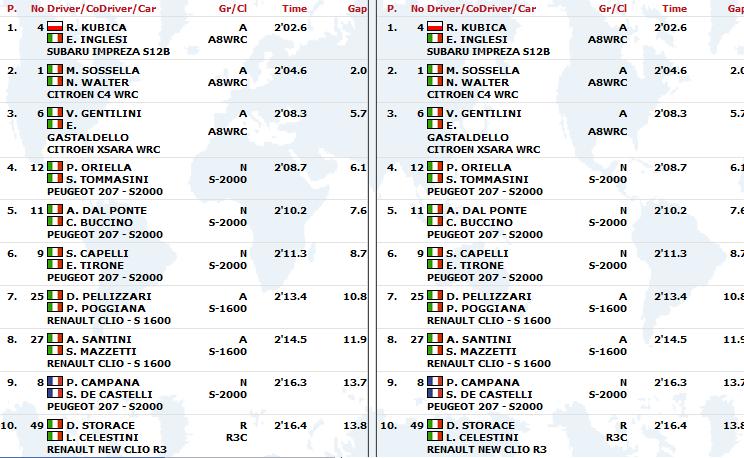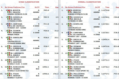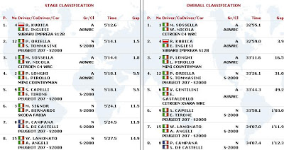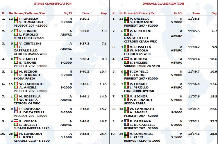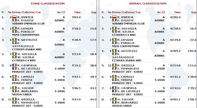 Po drugim odcinku specjalnym, w którym Robert Kubica był 10. i stracił 16,7s. do lidera, Polak spadł na 4. miejsce w klasyfikacji generalnej. Do prowadzących P. Orielli i S. Tommasiniego krakowianin traci 10.6 s. Prawdopodobnie na drugim odcinku Robert nie trafił z doborem opon i to kosztowało go cenny czas. Oto klasyfikacja generalna: