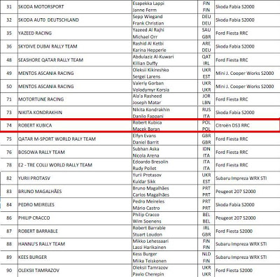 Jadący z pilotem Maciejem Baranem Kubica będzie rywalizował przede wszystkim z rywalami klasy WRC2 w swoim Citroenie DS3 RRC. Głównym rywalem Polaka będzie Esapekka Lappi. Wiadomo już, że Robert pierwszego dnia będzie startował jako 18.