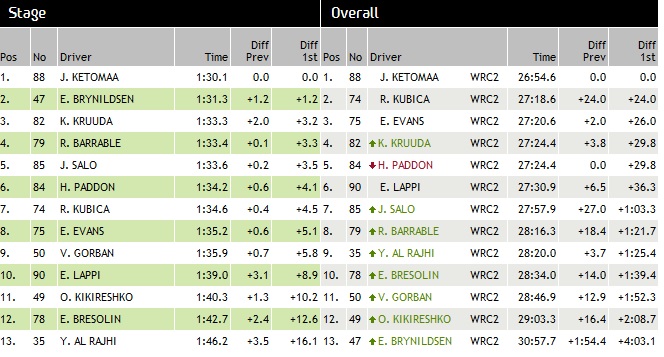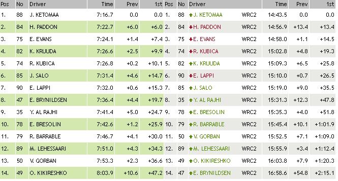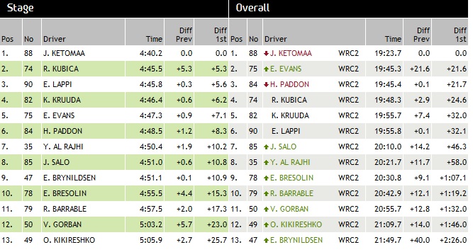 Robert Kubica zajął drugie miejsce na 5. OS-ie, minimalnie przegrywając z Karlem Kruudą. Polak awansował na 2. miejsce w klasyfikacji generalnej klasy WRC2!