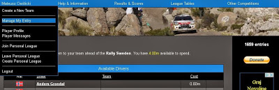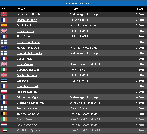 Po pierwsze, trzeba wejść na portal www.fantasywrc.com i założyć swój zespół. Wybieramy kierowców do naszego zespołu WRC (WRC). Każdy kierowca ma określoną “wartość” nie przejdzie zatem numer, że wybierzemy sobie Ogiera, Latvalę, Mikkelsena i Kubicę, bowiem mamy ograniczony “budżet”. Trzeba zatem kombinować 🙂 Nasz budżet to 10, a tak przedstawiają się wartości poszczególnych kierowców przed startem sezonu: