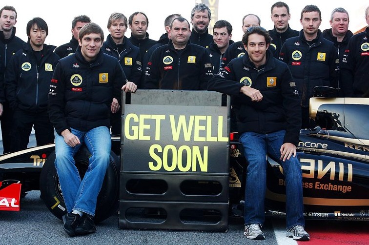 | Witalij Pietrow z częścią bolidu Lotus Renault F1, na której są wyrazy wsparcia dla Roberta |