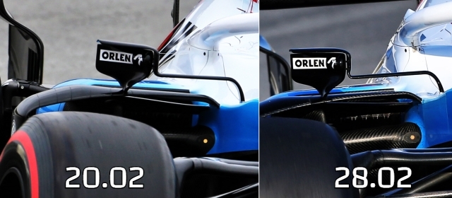 Na te pierwsze miał zwrócić uwagę Andrew Green, dyrektor techniczny Racing Point. Chodziło o to, że lusterka znacząco zmieniają przepływ powietrza wokół bolidu. Pojawiły się również wątpliwości co do widoczności, jaką mają George Russell i Robert Kubica. Pierwotnie lusterko było podzielone na trzy części, potem jednak to zmieniono. W artykule Nugnesa mamy informację, że Williams zmienił też kształt obudowy i mocowań lusterek, ale na zdjęciach z 20 lutego i 28 lutego dużych różnic nie widać.