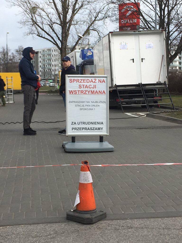 Zamknięta jest jedna z warszawskich stacji benzynowych, na której trwają zdjęcia. Robert w kombinezonie dedykowanym Orlenowi.