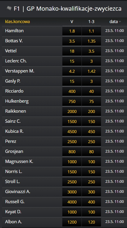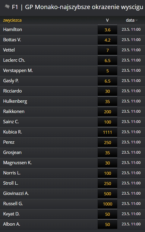 Co ciekawe, poza czołową szóstką czyli kierowcami trzech najlepszych zespołów, największe szanse daje się Danielowi Ricciardo z Renault. Tym co dziwi jeszcze bardziej jest kurs na Australijczyka… 500! Biorąc pod uwagę, że to Monako – dość odważnie, ale chyba trudno wątpić w to, że ktoś spoza czołowej trójki będzie miał szanse na triumf w Księstwie.