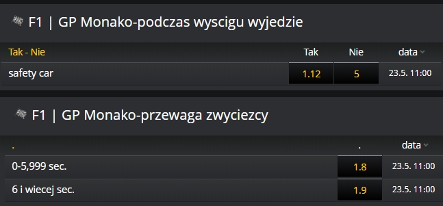 Nie dziwi kurs zaledwie 1.28 na zwycięstwo któregoś z kierowców Mercedesa. Dziwi natomiast kurs aż 8 na zwycięstwo Ferrari. I ja właśnie na ten kurs zainwestuję skromne 10 zł. W tłoku w Monako w kwalifikacjach zawsze może się coś zdarzyć.