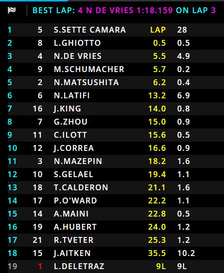 Pozycje tracił też Zhou. Spadł na 6 miejsce, a wyprzedzili go kolejno De Vries, Schumacher, a także szalejący Matsushita.
