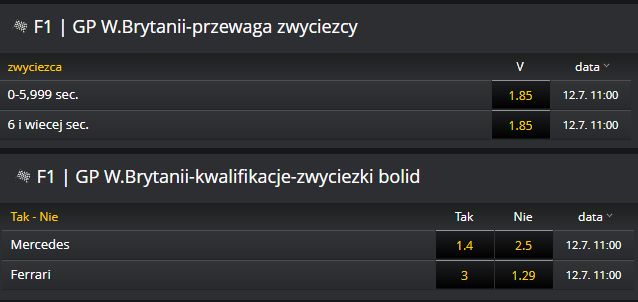 Obstawiać można również zwycięski bolid w kwalifikacjach oraz przewagę zwycięzcy na mecie.