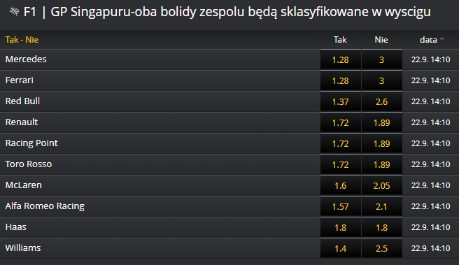 Kurs na to, że oba Williamsy będą sklasyfikowane w wyścigu wynosi 1.4 Niższy jest tylko na bolidy Mercedesa i Ferrari.