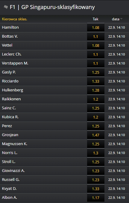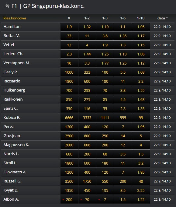 Kurs na Hamiltona wynosi 1.9, a na Leclerca 2.3. Pozostałym zawodnikom daje się znacznie szanse. Kurs na Verstappena to 10, Vettela 12, a Bottasa aż 33. Wysokie są kursy na punkty Daniela Ricciardo, Romaina Grosjeana, Kevina Magnussena, Lance Strolla czy Danila Kvyata. Kurs na pierwszą 10-tkę George Russella jest 2,5 raza niższy niż na Roberta Kubicę.
