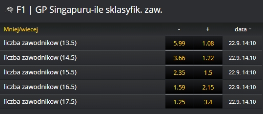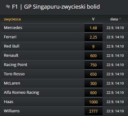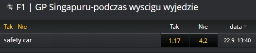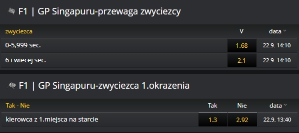 Obstawiać można również inne zdarzenia, m.in. to jaka będzie przewaga kierowcy lub po pierwszym okrążeniu będzie prowadził kierowca, który startował jako pierwszy.