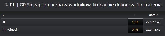 Mimo że to Singapur, to Fortuna większe szanse daje na to, że wszyscy kierowcy dokończą pierwsze okrążenie.