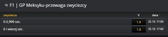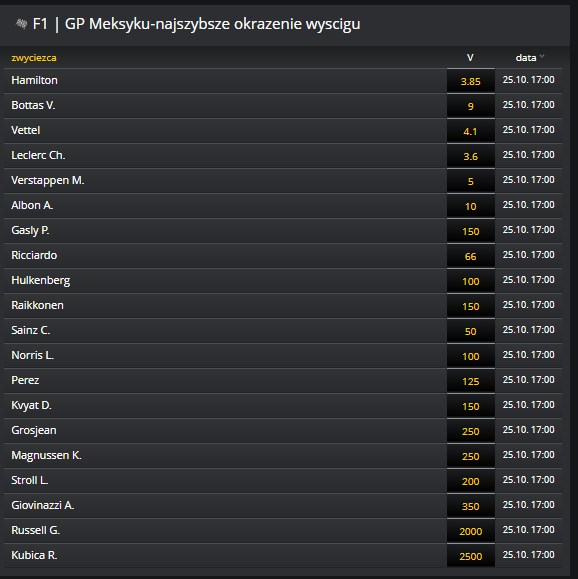 Delikatnym faworytem rywalizacji na Autodromo Hermanos Rodriguez jest Charles Leclerc, na którego kurs to 2.7. Nieco mniejsze szanse ma Lewis Hamilton.