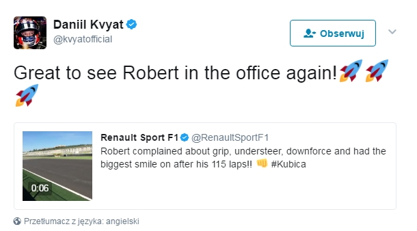 O teście Polaka piszą wszyscy – media, Formuła 1 czy jego rywale – Fernando Alonso czy Mark Webber. Powrotu Kubicy do bolidu F1 pogratuluje również Danil Kvyat, który półtora roku później wspólnie z Kubicą wróci do F1.