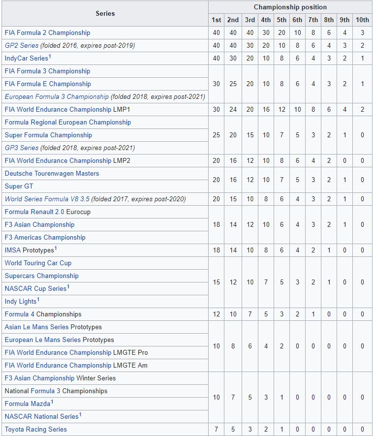 Aby uzyskać Superlicencję trzeba zgromadzić w ciągu ostatnich 3 lat minimum 40 punktów, chyba że miało się już wcześniej superlicencję.